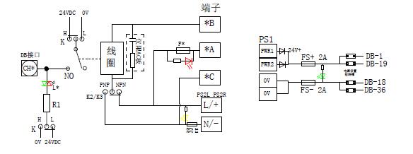 內(nèi)部接口表: 原理圖: 接線圖: 常用設(shè)置: 輸入輸出型式出廠設(shè)置:輸入形式為共陰,輸出形式為高電平。 改變開(kāi)關(guān)K 位置可改變信號(hào)輸出制式: H:輸出為高有效,適合歐美PLC; L:輸出為低有效,適合日臺(tái)PLC 信號(hào)反向(邏輯非):背面焊連改變開(kāi)關(guān)K2(CH1-16)/K3(CH17-32)位置可改變信號(hào)輸入制式:PNP 或NPN 干接點(diǎn)是采用PNP 型式 電源設(shè)置: DB 口含有4 芯電源線,用于向PLC 模塊供電。這些電源由電源輸出設(shè)置的短路帽進(jìn)行控制,每個(gè)短路帽對(duì)應(yīng)一根線,送電前應(yīng)根據(jù)需要進(jìn)行設(shè)置。電源指示在保險(xiǎn)下方,電源接反或保險(xiǎn)燒斷時(shí)電源燈不亮。 注意:為實(shí)現(xiàn)信號(hào)的徹底隔離,內(nèi)外電源必須做到隔離,因此本板需要外部電源,在端子板的左下角標(biāo)注為L(zhǎng)+/N-的端子為外部電源端子,須提供DC24V。外部信號(hào)為有源信號(hào)時(shí)該電源無(wú)需提供。端子塊右側(cè)為電源負(fù)端保險(xiǎn),F(xiàn)N-1:外部電源PS2L 負(fù)端總保險(xiǎn), FN-2:外部電源PS2R 負(fù)端總保險(xiǎn)。 注意:輸入電壓等級(jí)與繼電器線圈電壓必須一致。