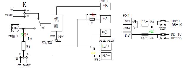 針腳定義 常用設(shè)置: 1、開關(guān) K 用于高低有效切換 高有效(H)適用于歐美系 PLC,低有效(L)適用于日臺(tái)系 PLC 2、開關(guān) K2(CH1-16)、K3(CH17-32)用于 NPN/PNP 切換,干接點(diǎn)輸入時(shí)選PNP 檔。 電源設(shè)置: DB 口含有 4 芯電源線,用于向 PLC 模塊供電。這些電源由電源輸出設(shè) 置的短路帽進(jìn)行控制,每個(gè)短路帽對(duì)應(yīng)一根線,送電前應(yīng)根據(jù)需要進(jìn)行設(shè)置。指示在保險(xiǎn)下方,電源接反或保險(xiǎn)燒斷時(shí)電源燈不亮。
